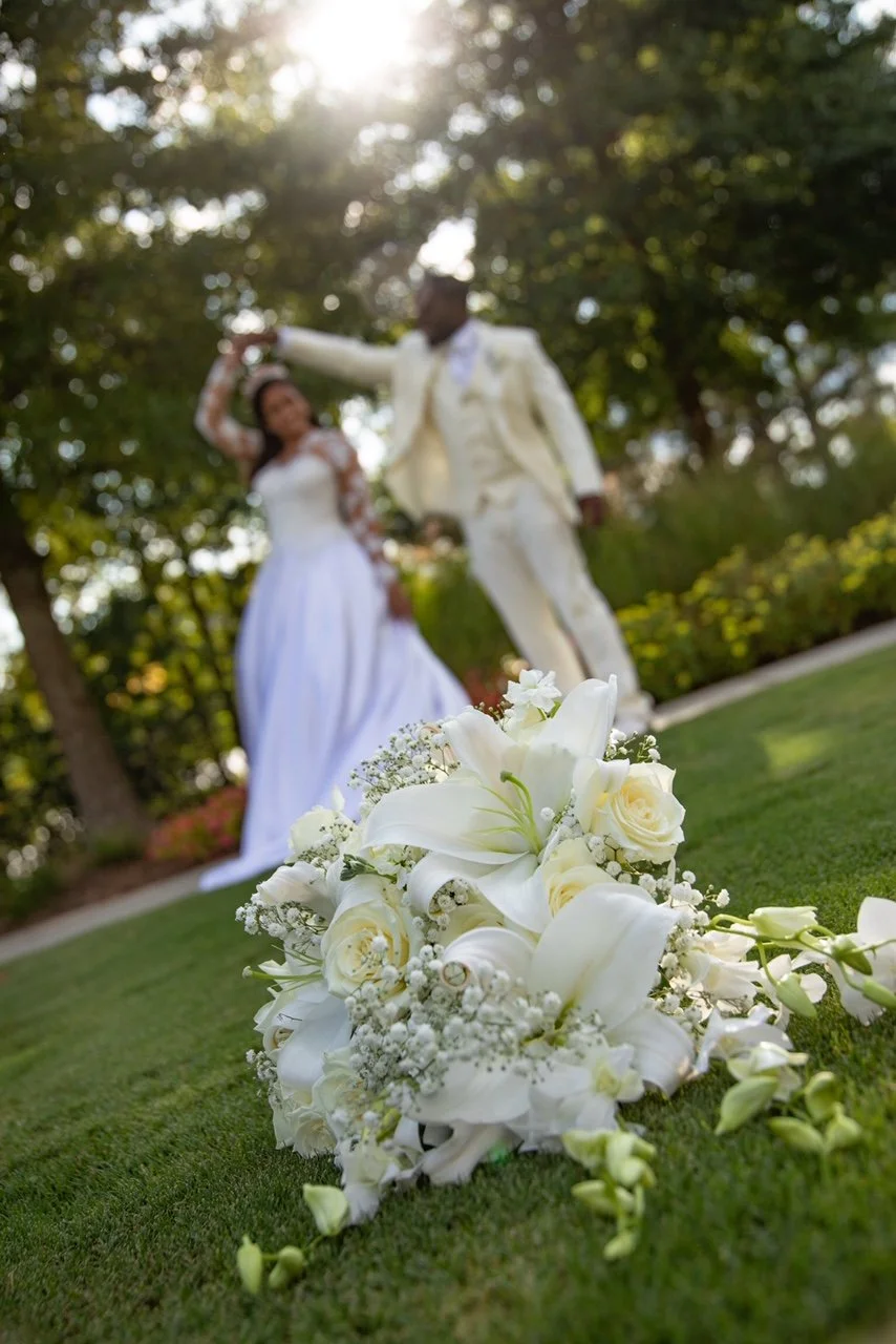 Wedding bouquet with white roses, lilies, and baby's breath on green grass with a blurred bride and groom dancing in the background under trees.