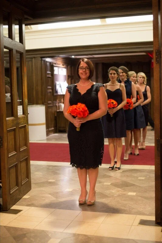 Bride in white gown with six bridesmaids in black dresses, holding bouquets of green flowers and peacock feathers, standing under a covered walkway with brick building in background.