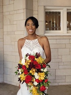 Bride in white wedding dress holding a bouquet of yellow, orange, and red flowers, standing outdoors with a veil flowing behind her.