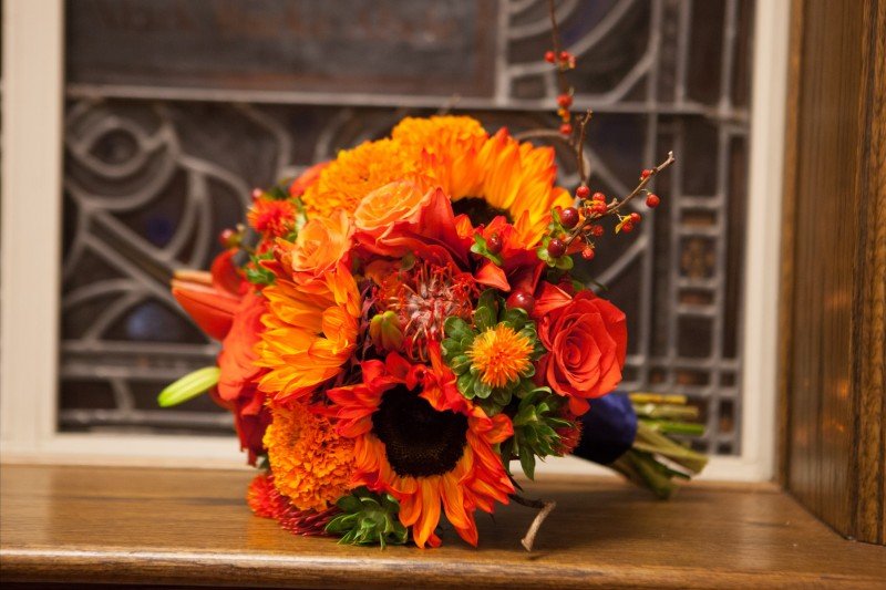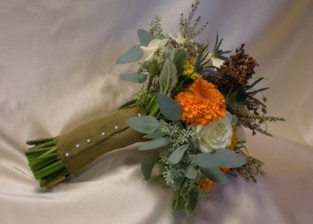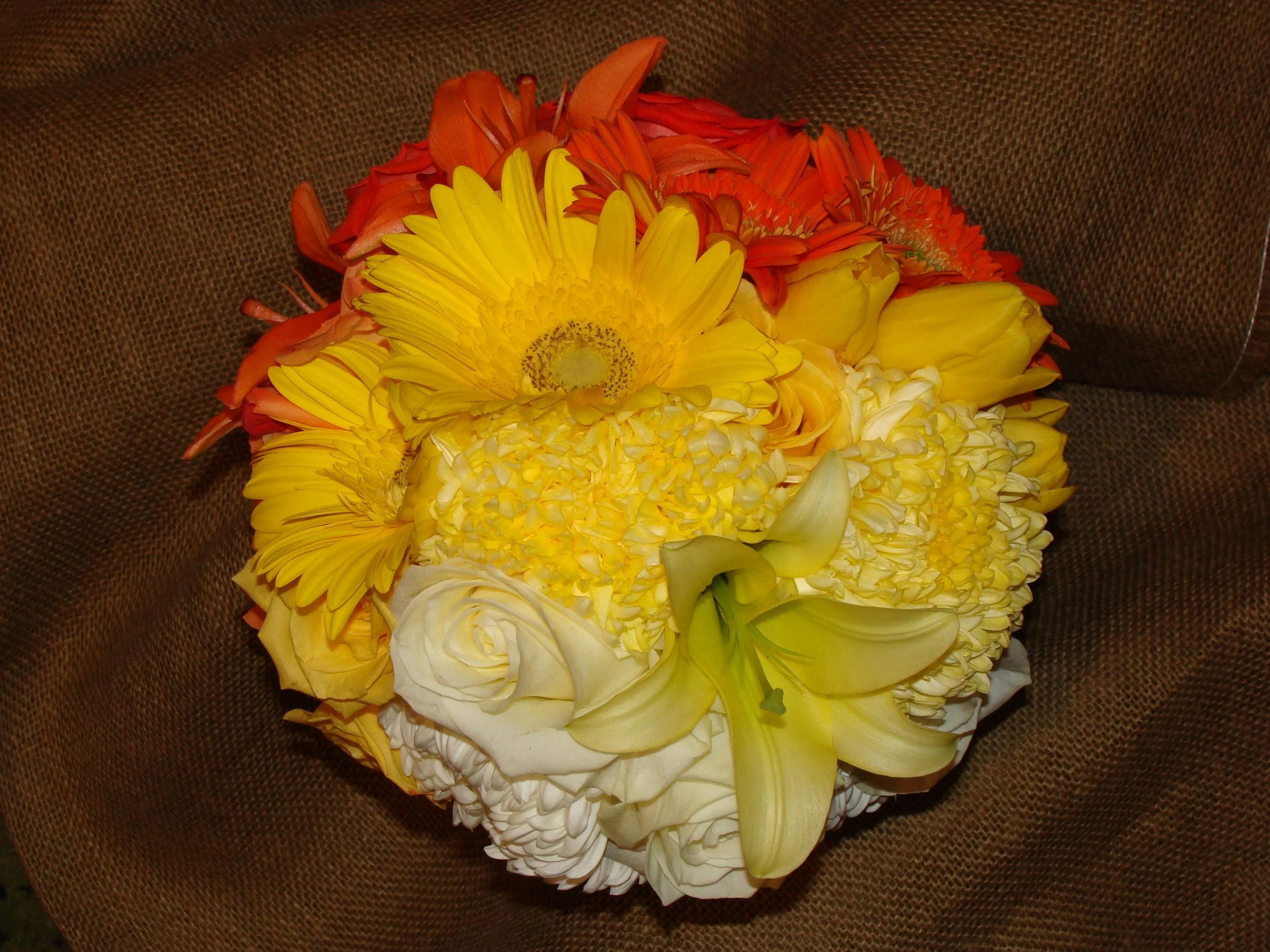A chromatic bridal bouquet of white yellow, and orange flowers on a brown fabric surface.