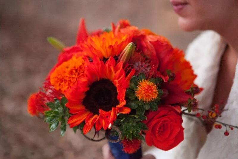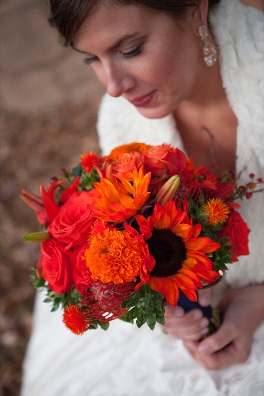 A bride in a strapless white wedding gown holding a bouquet of orange, yellow, and red flowers, standing outdoors with a blurred background.