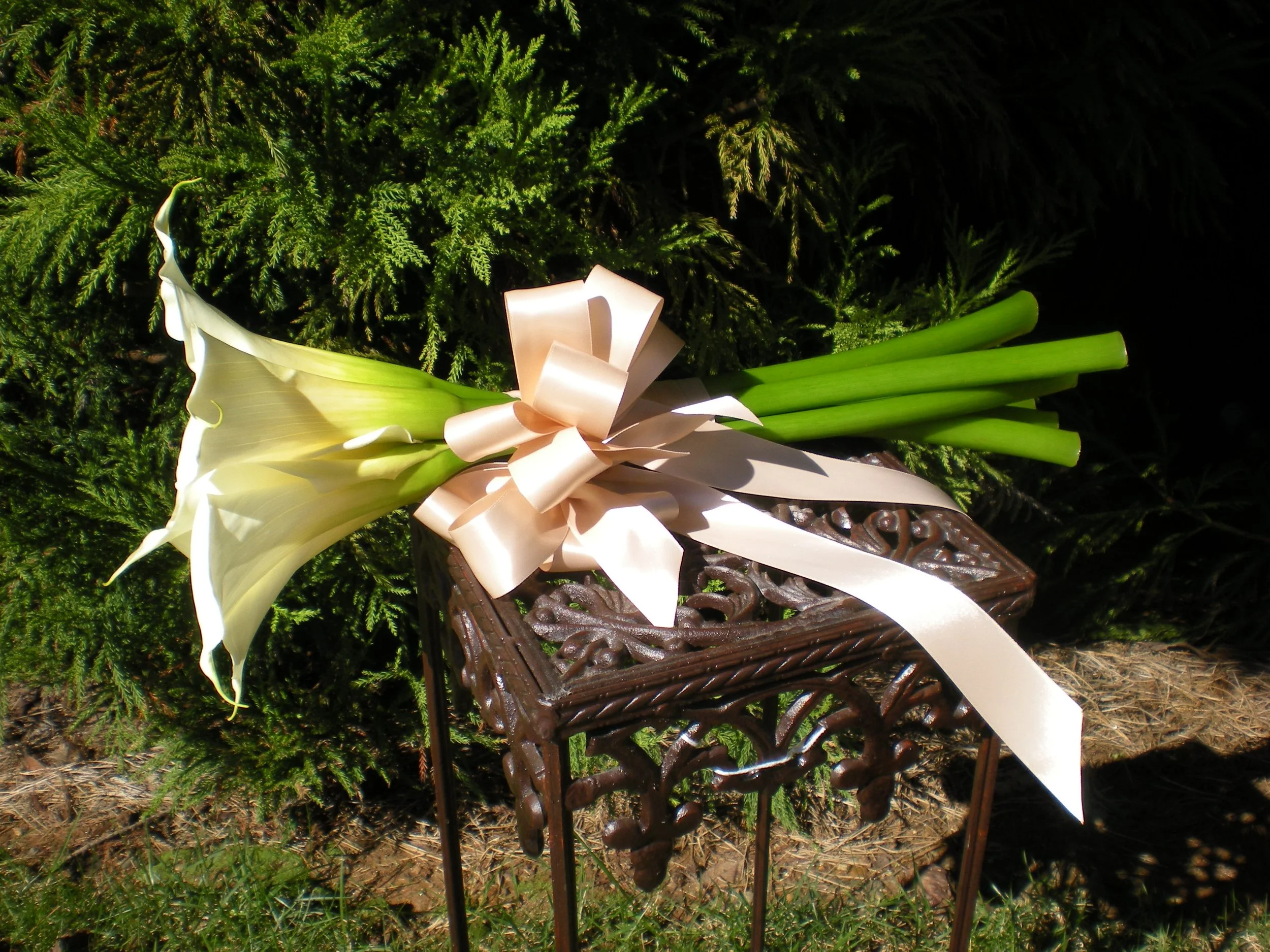 Bridal bouquet of white calla lily flowers with long  green stems wrapped with a pale pink satin ribbon lying on a decorative wrought iron stand outdoors, with green shrubbery in the background.