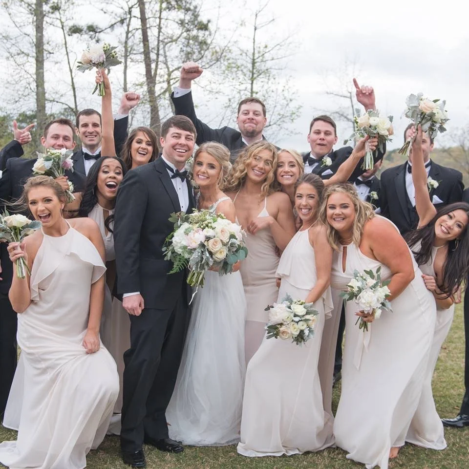 A group of happy people celebrating at a wedding, with the bride and groom in the center, holding bouquets, surrounded by bridesmaids and groomsmen outdoors.