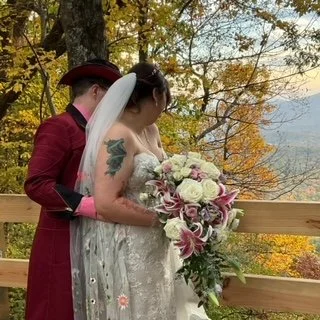 Bride holding a large bouquet of flowers, standing next to groom in a red suit, outdoors with autumn trees in background.