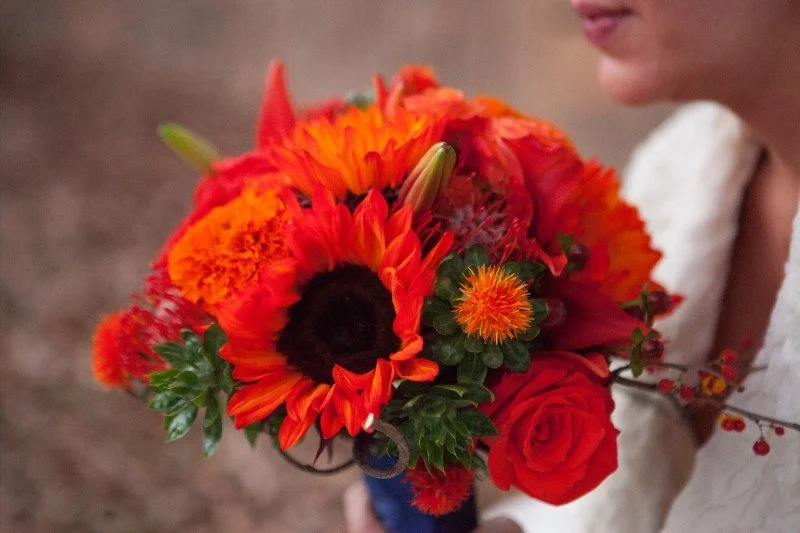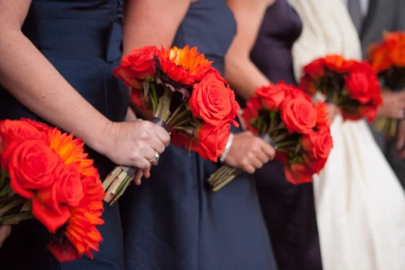 Close-up of women dressed in maroon holding bouquets of sunflowers, roses, and berries.
