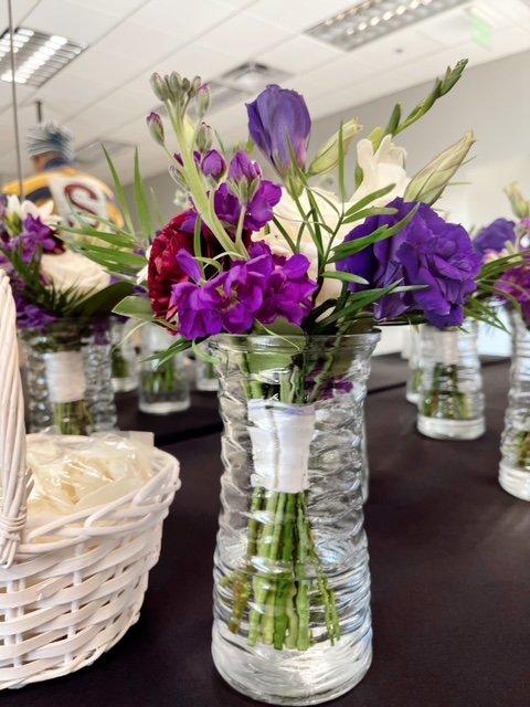 A clear glass vase with a purple, white, and pink wedding bouquet on a black table, surrounded by additional small vases with flowers and a white basket with cloth or paper inside.