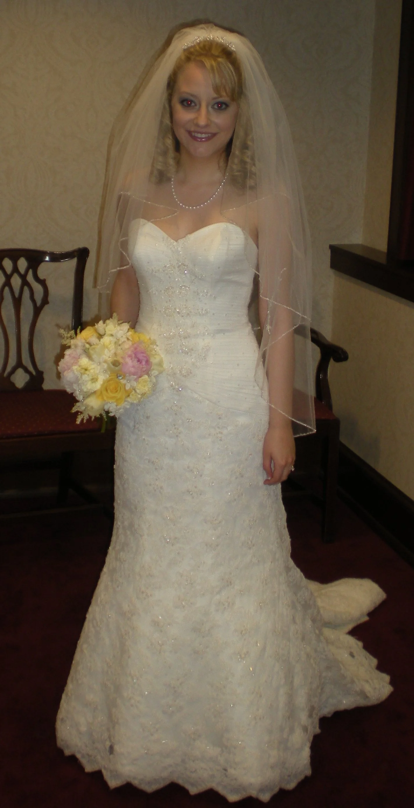 A woman in a white wedding dress with lace details, holding a bouquet of yellow, pink, and white flowers, standing indoors in front of a patterned wall and wooden chairs.