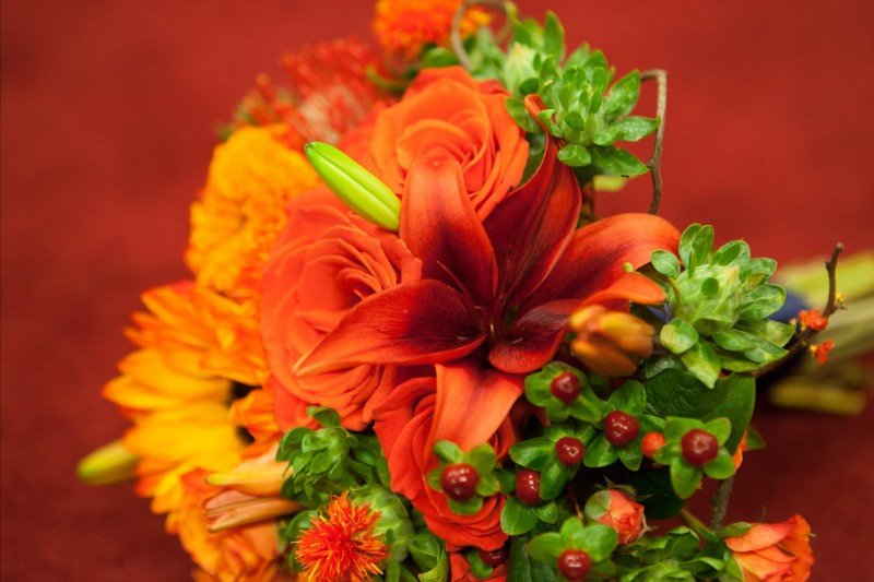 Bouquet of white roses, orange lilies, maroon chrysanthemums, green and purple foliage, and red berries, resting on a purple cloth.