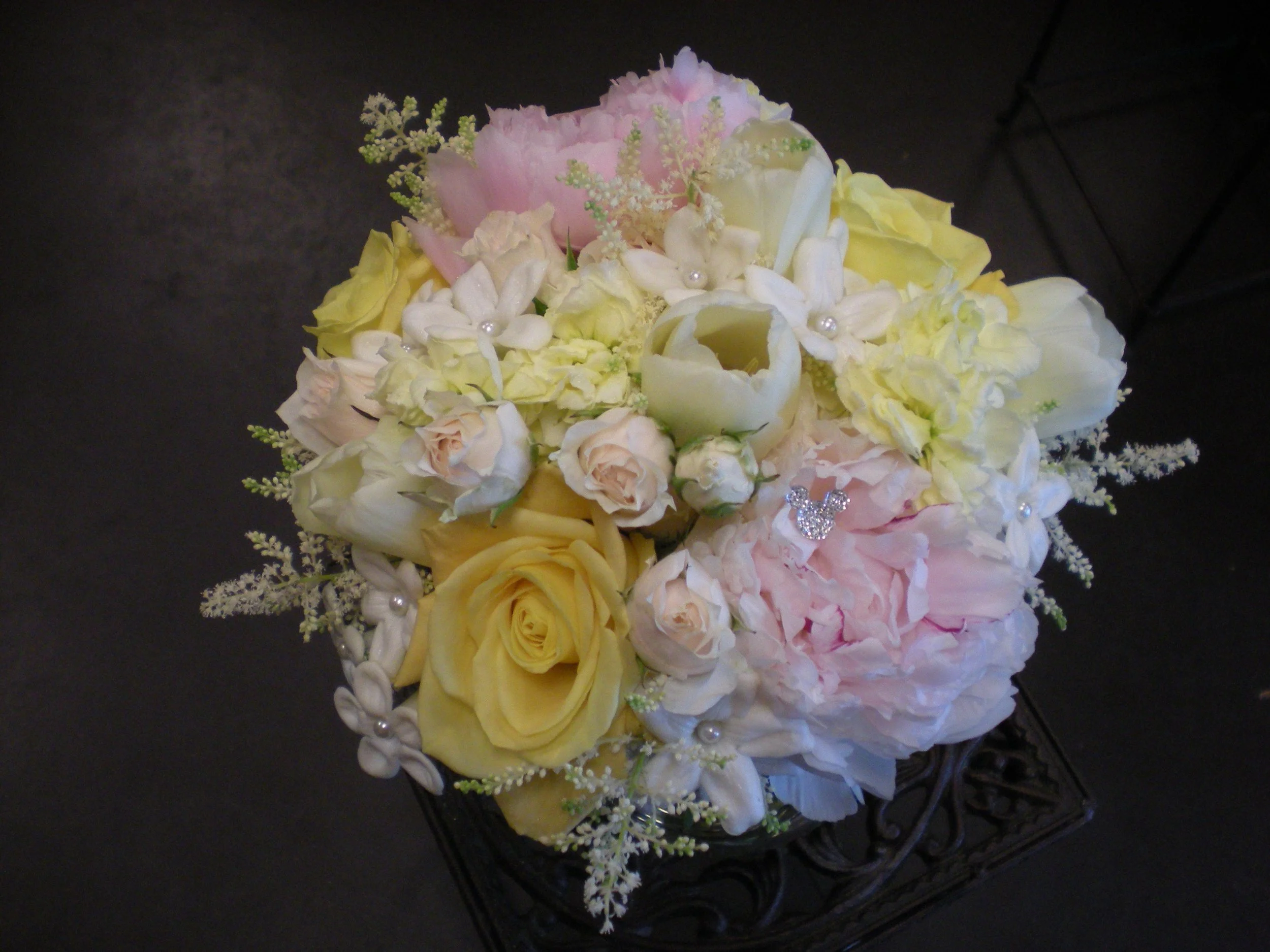 A bouquet of pink, yellow, and white flowers, including roses and peonies, decorated with pearls and a small Mickey Mouse charm.