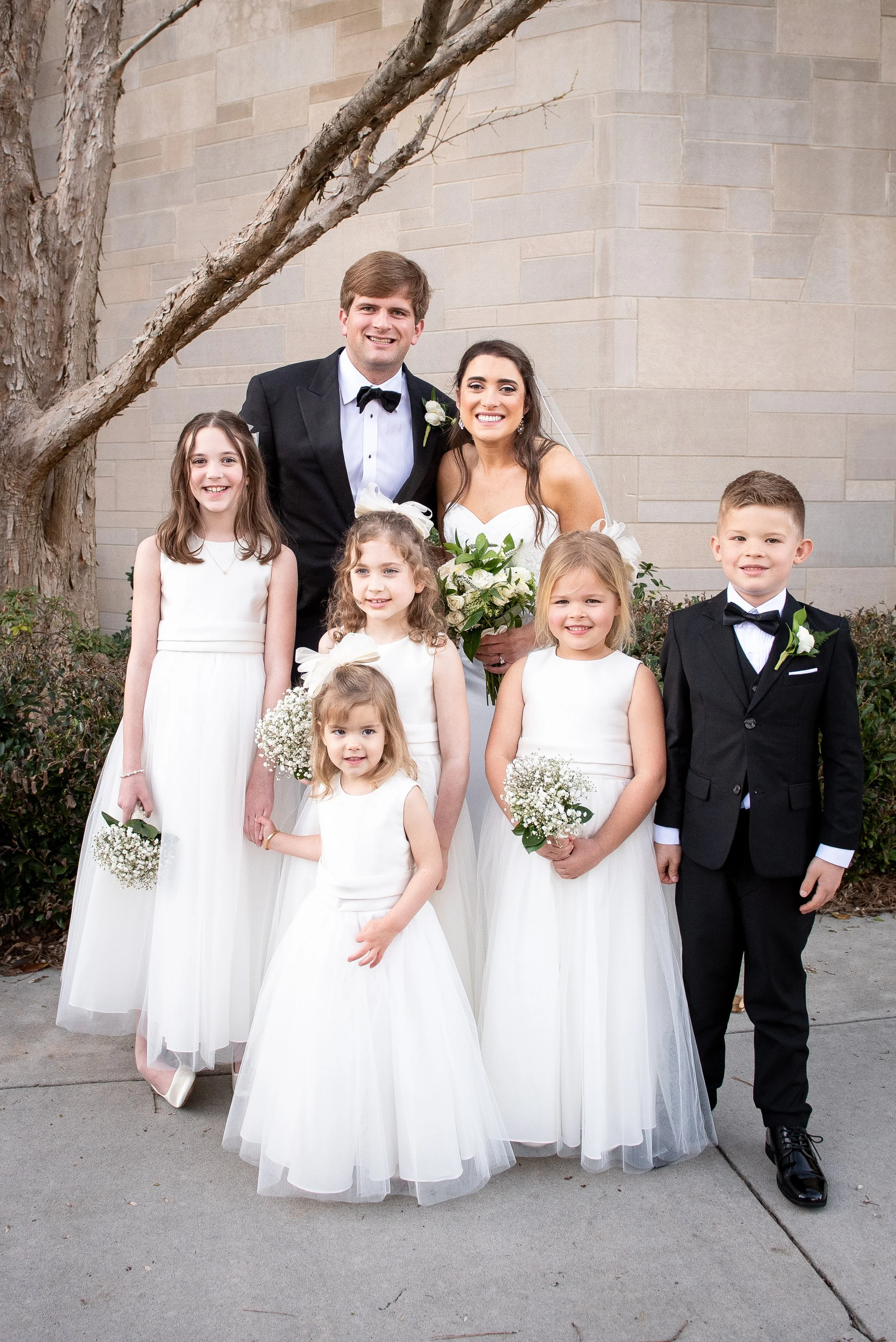 A wedding party with a bride, groom, and five children stands outside against a stone wall and a tree. The bride wears a white wedding dress and holds a bouquet of white flowers. The groom wears a black tuxedo with a bow tie. Three girls are dressed