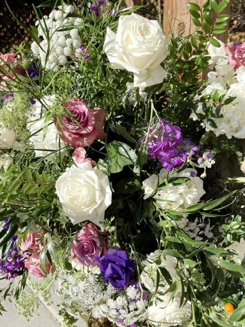 A bouquet of mixed flowers including roses, ranunculus, and greenery in a vase.