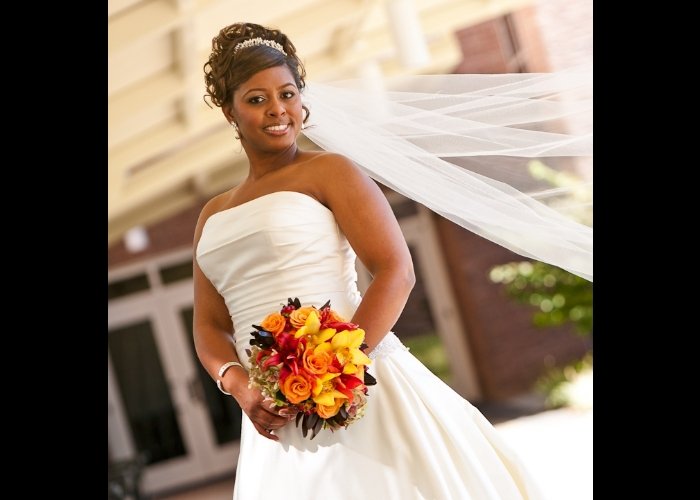 A bride wearing a white strapless wedding gown and a veil, holding a bouquet of white orchids and red flowers, smiling outdoors with trees in the background.