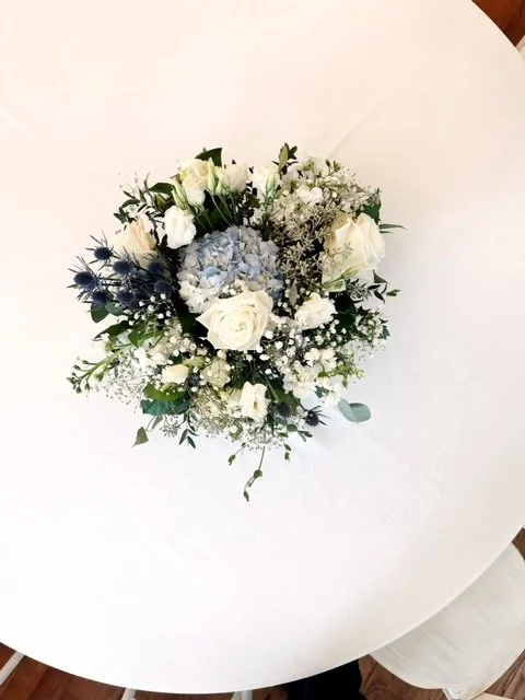 Top down view of a fresh white and blue flower centerpiece on a white surface
