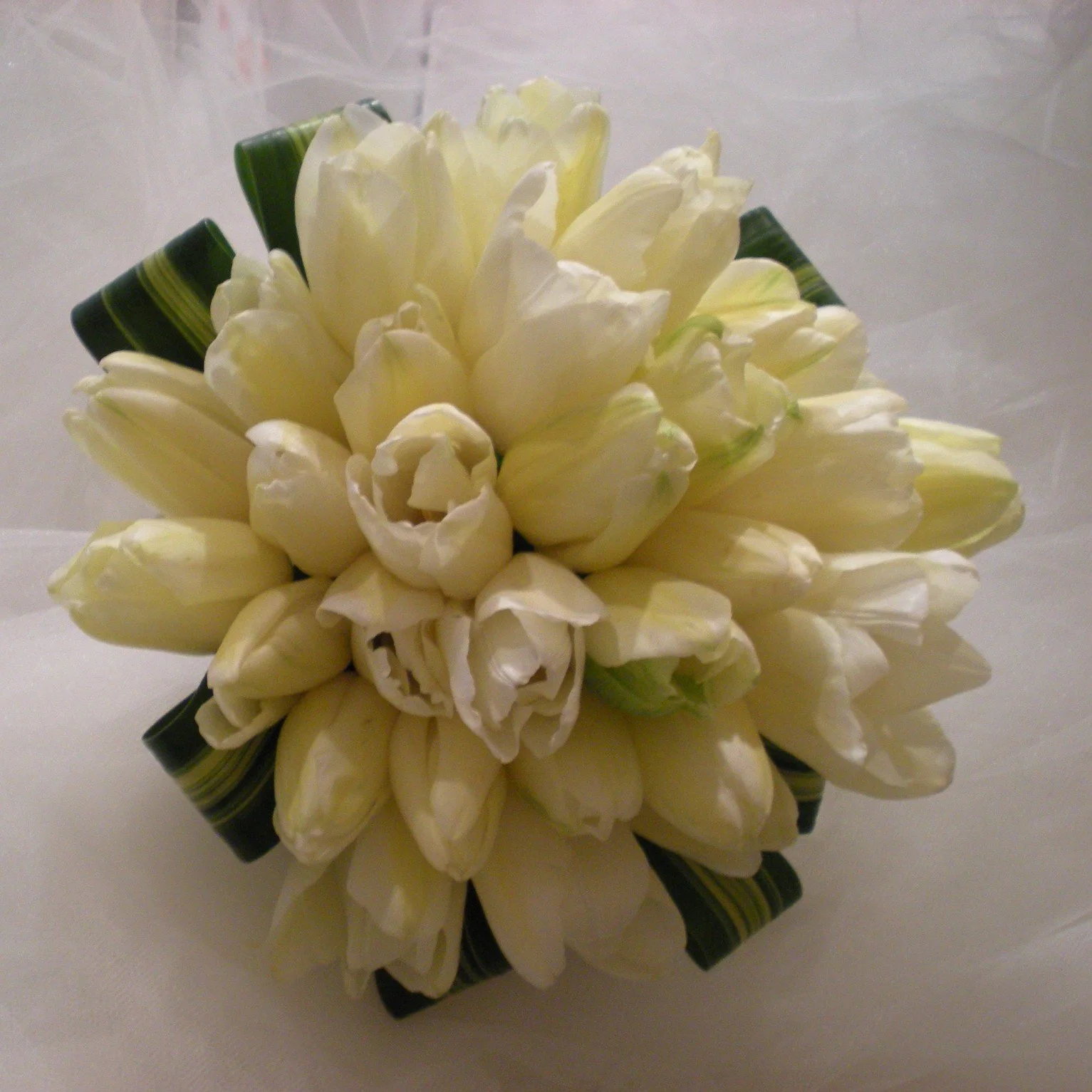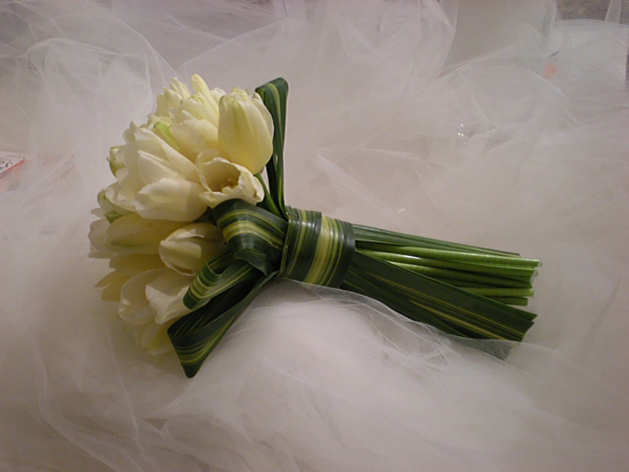 A bouquet of white tulips tied with green, yellow, and black striped ribbon, resting on white tulle fabric.
