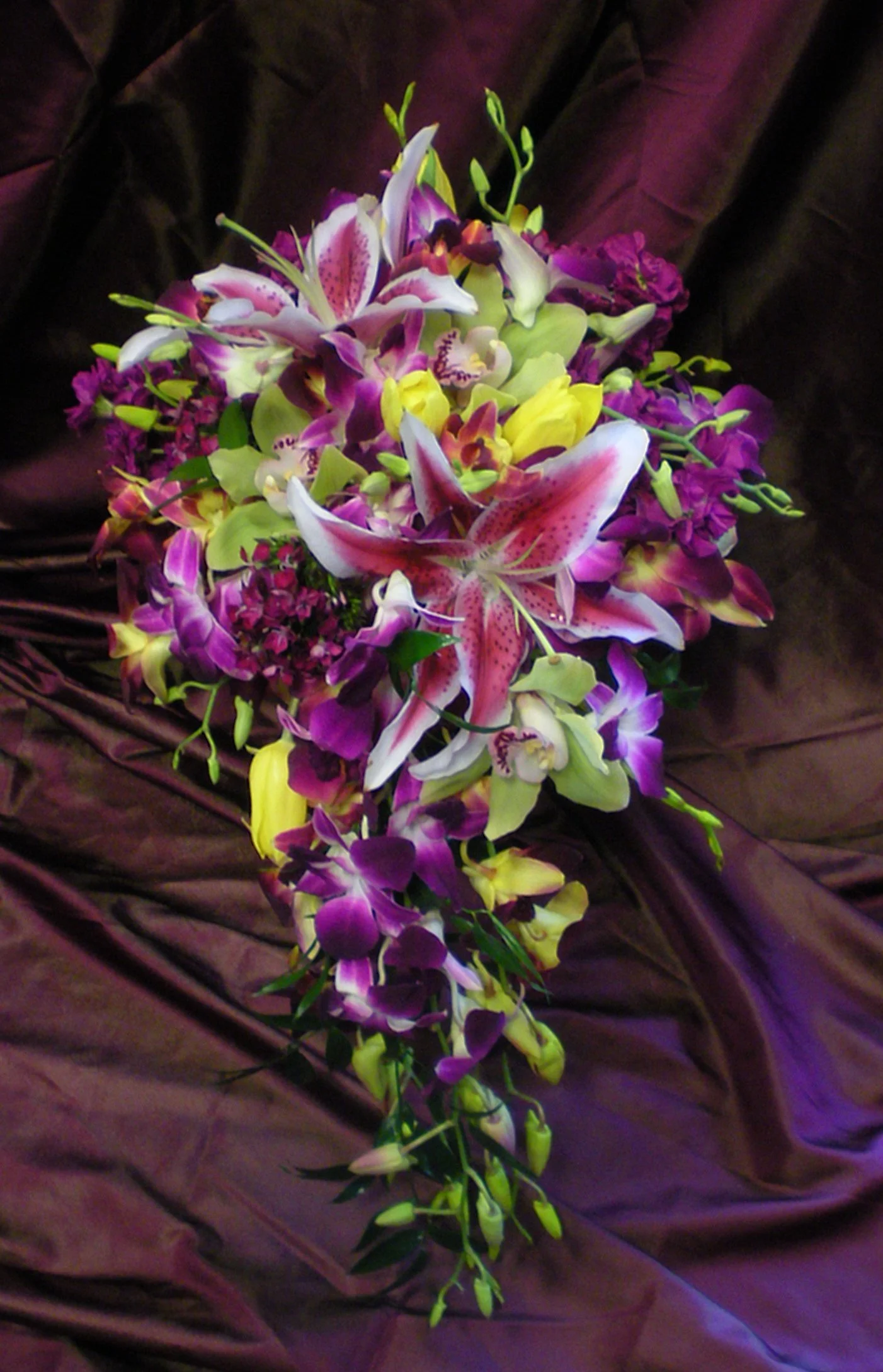 A floral arrangement featuring purple and pink roses, purple orchids, and some small, round, greenish flowers with gold edges.