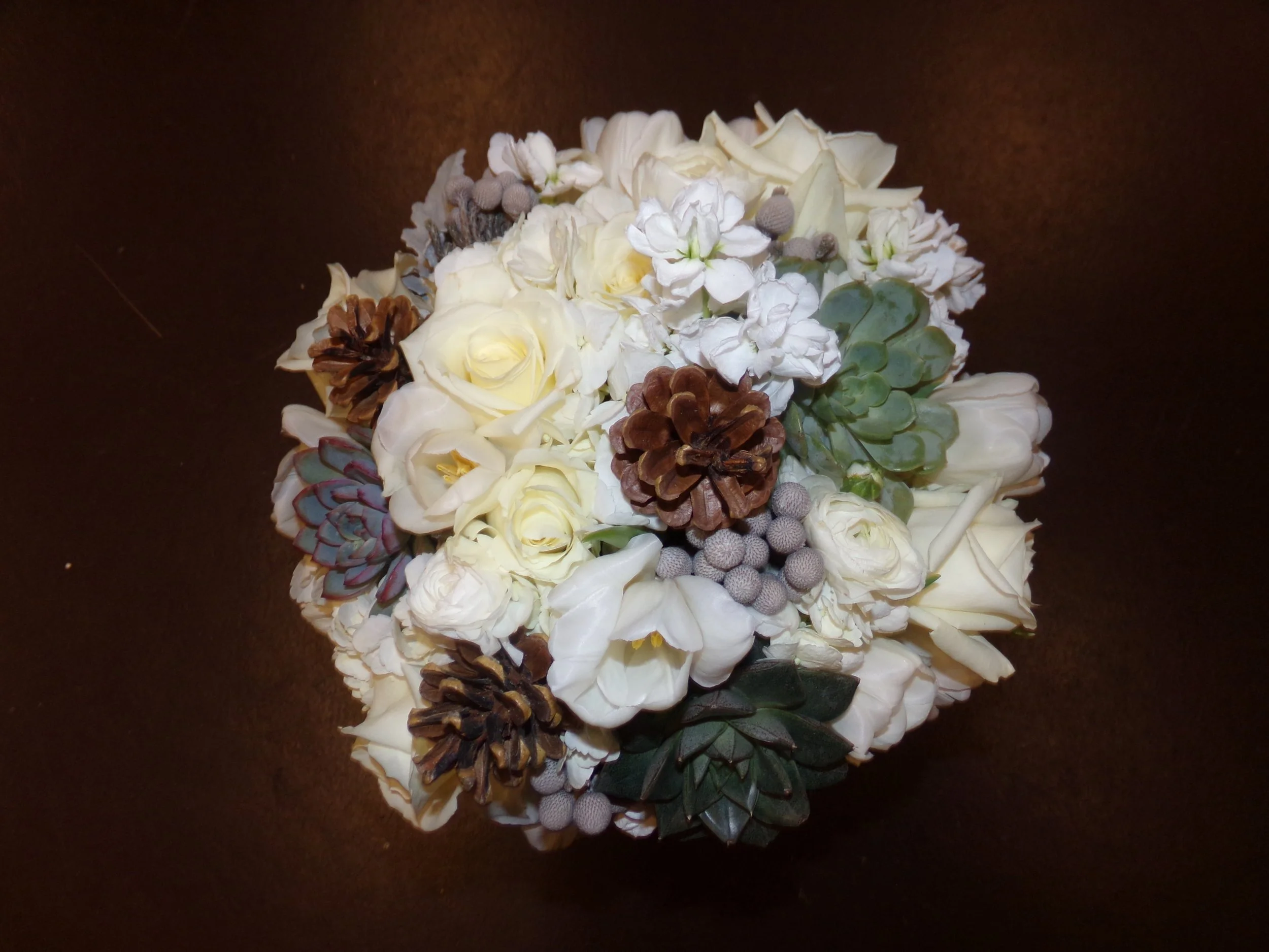 A bouquet of white roses, white chrysanthemums, and yellow button mums, accented with purple and green succulents, resting on a textured dark gray fabric surface.