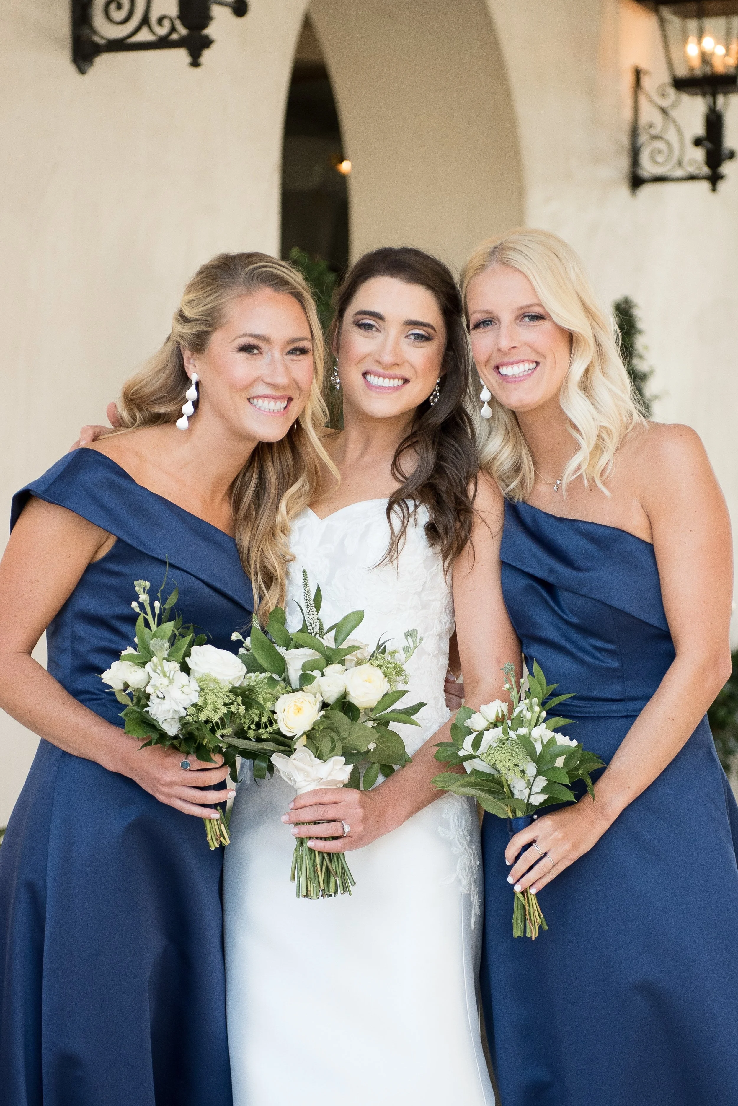 A bride in the middle of 2 bridesmaids standing close together, smiling, holding bouquets of white flowers and greenery, in an elegant setting.