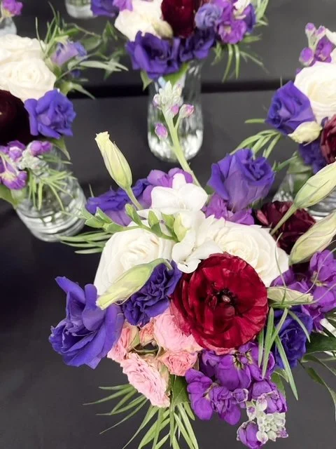 A group of bridal bouquets purple, white, pink, and red flowers in glass vases on a black table.