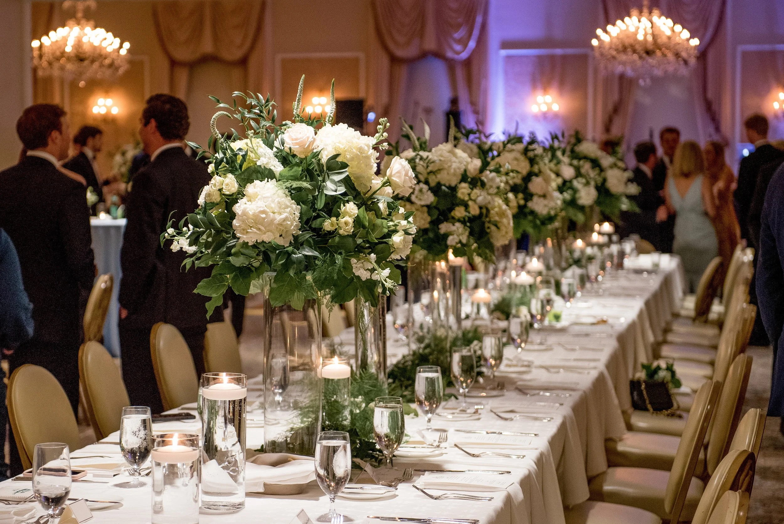 Elegant banquet room decorated with white floral centerpieces and green foliage on a long dining table set with silverware and water glasses, with additional round tables in the background, chandeliers hanging from the ceiling, and cream-colored wall