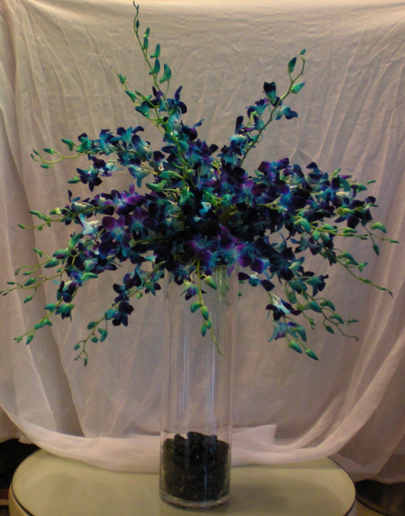 A tall glass vase with dark stones at the base holding a large arrangement of blue and purple artificial flowers with long, curved green stems.