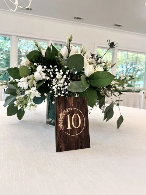 A floral centerpiece with white flowers and greenery on a white table, featuring a wooden table number sign with the number 10 engraved and a laurel wreath design.