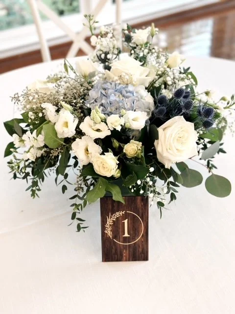 A floral arrangement with white roses, blue hydrangea, and various greenery in a wooden vase with the number 1 engraved on it, on a white tablecloth at an event.