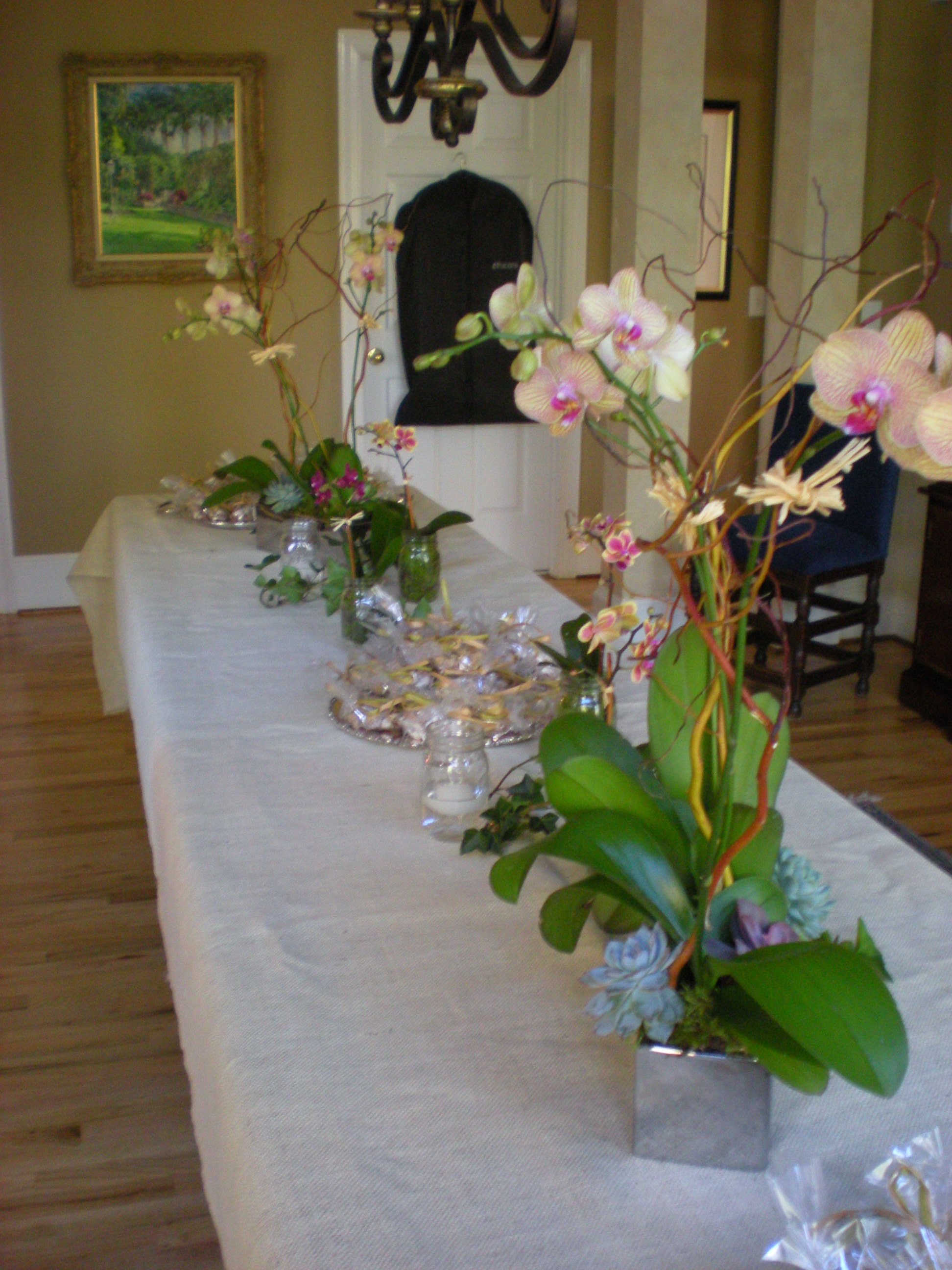 Arrangement of white orchids, green spider mums, and other greenery in a decorative metal tray on a wooden table.