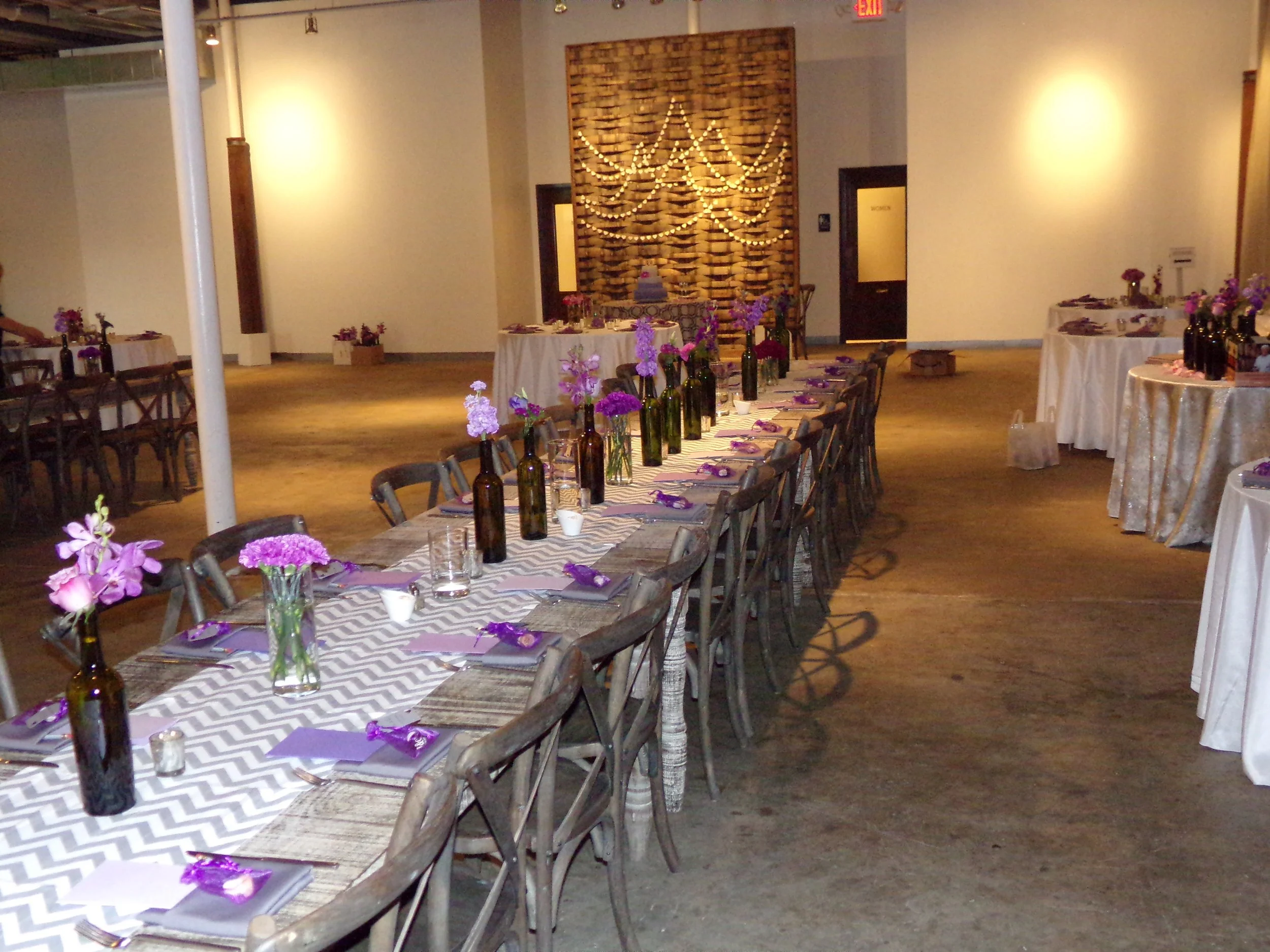 Long banquet table decorated with purple flowers in glass bottles and purple napkins in a spacious event hall with additional round tables, wooden chairs, and warm lighting.