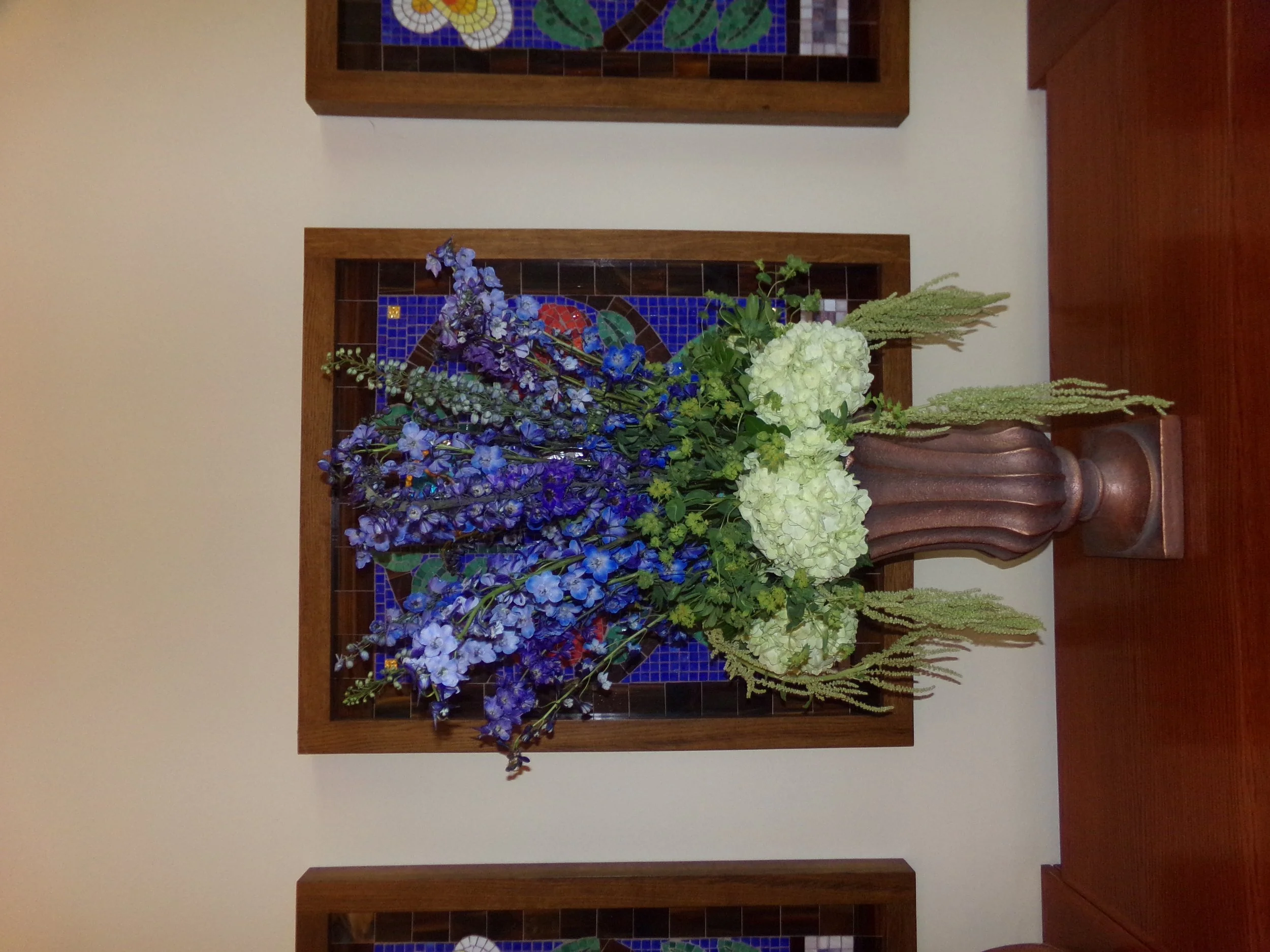 A floral arrangement with purple and white flowers in a brown vase, set against a stained glass window with blue, red, green, and yellow mosaic patterns.